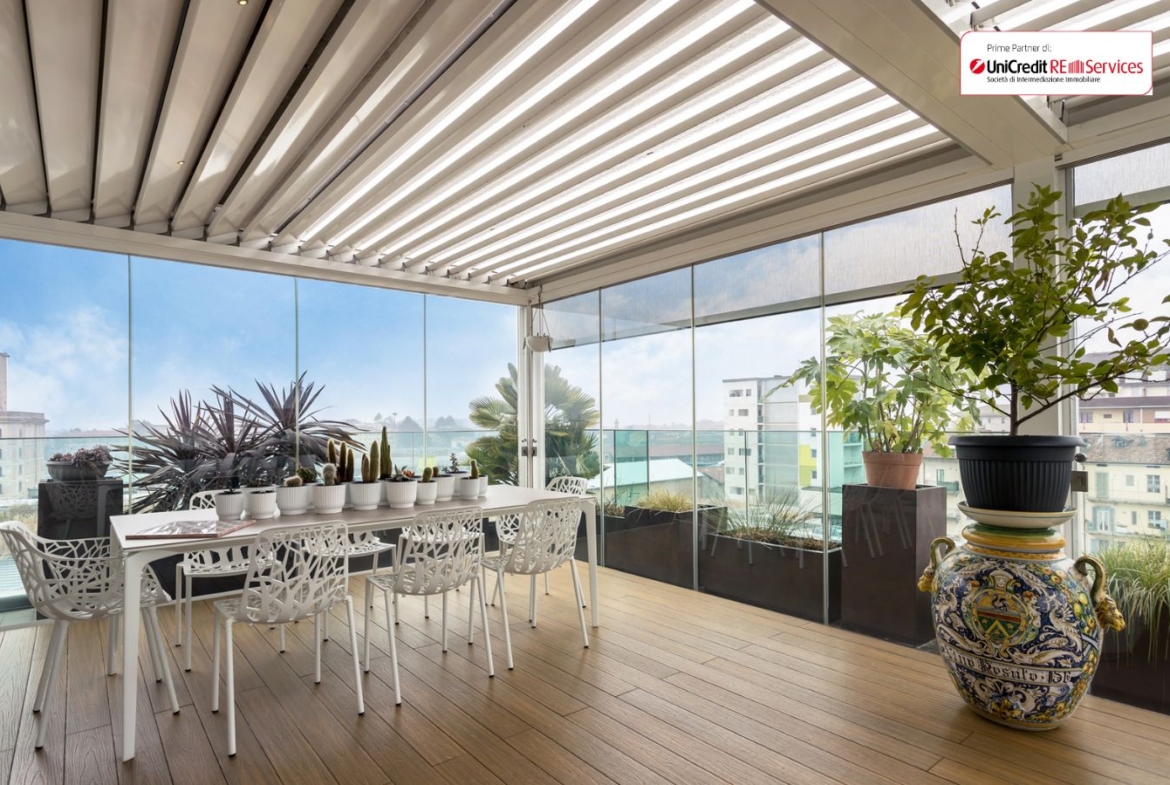 In posizione centrale del comune di Bergamo, proponiamo in vendita esclusivo attico posto al quinto ed ultimo piano di una residenza di recente costruzione servita da ascensore. Questa interessante soluzione si compone di ampia e luminosa zona living con cucina separata abitabile, disimpegno, camera padronale con cabina armadio e bagno in suite, ulteriori due camere e due bagni. Nota di pregio dell’immobile è la terrazza panoramica perfettamente fruibile in ogni stagione grazie alla serra bioclimatica installata. Impianto fotovoltaico da 7 kw con batteria di accumulo, impianto di domotica, impianto di condizionamento canalizzato, impianto di allarme completo ed alto grado di finiture. Completano la proprietà l’autorimessa e la cantina al piano secondo interrato. Possibilità di secondo box. Euro 790.000. In collaborazione con Unicredit RES. (Classe energetica A2 – IPE 64,59 kWh/mqa)