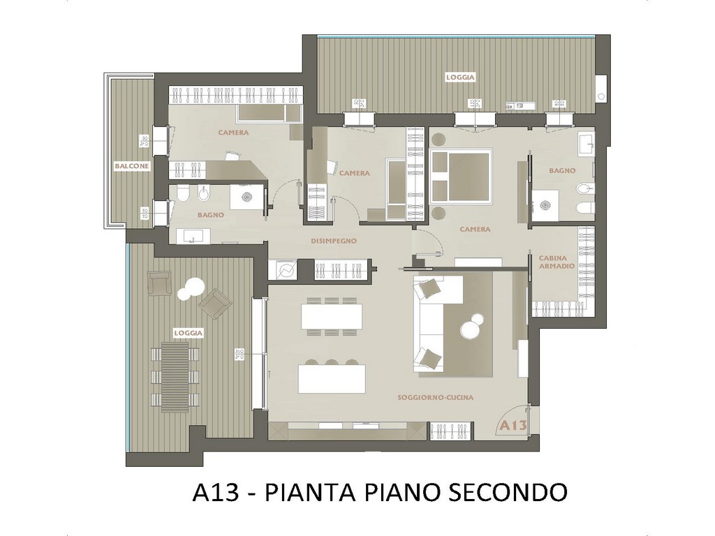 La soluzione del quadrilocale A13 posto al piano secondo si compone di ingresso, ampia e luminosa zona living con cucina a vista con affaccio su una loggia da 24 mq, disimpegno, tre camere di cui una con cabina armadio e bagno en suite e un ulteriore bagno. Completano la proprietà due ulteriori terrazzi che circonda la zona notte.