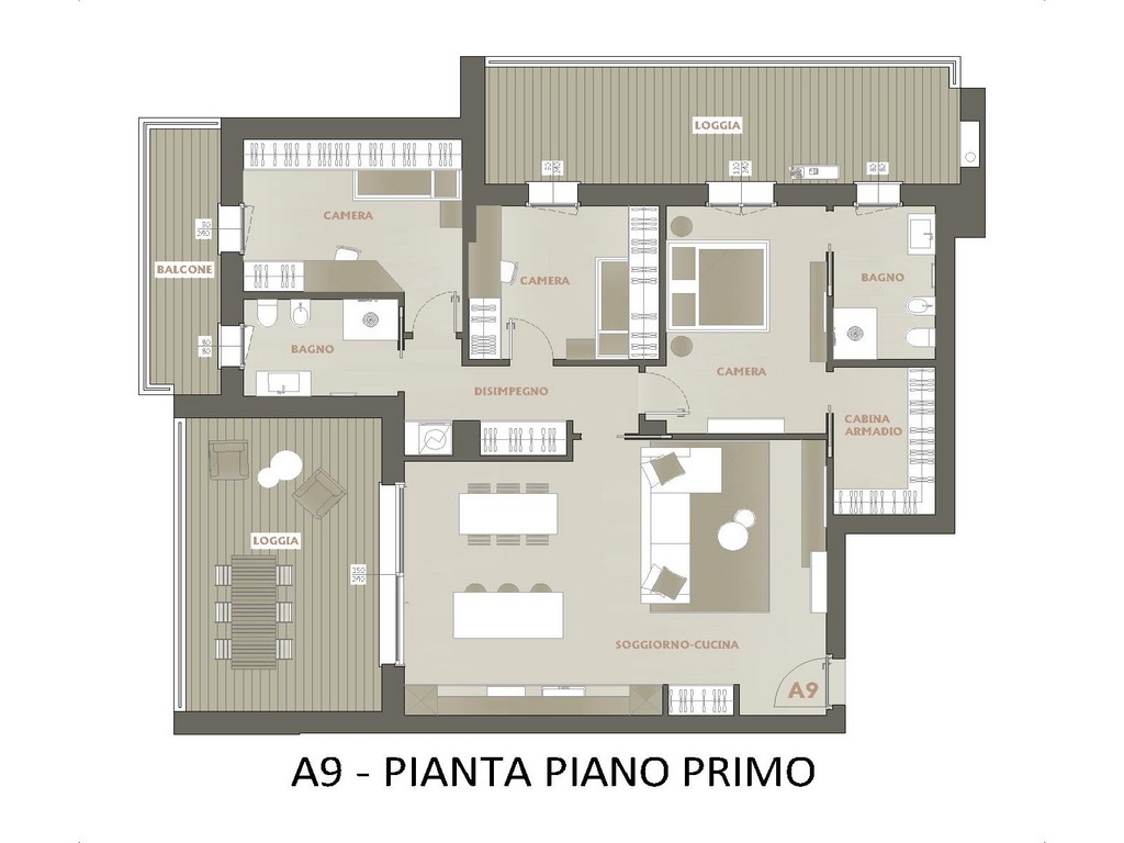 La soluzione del quadrilocale A9 posto al piano primo si compone di ingresso, ampia zona living con cucina a vista e affaccio su una loggia esterna abitabile, disimpegno, tre camere di cui la matrimoniale con cabina armadio e bagno en suite e un ulteriore bagno. 54 mq di terrazze circondano il quadrilocale.
