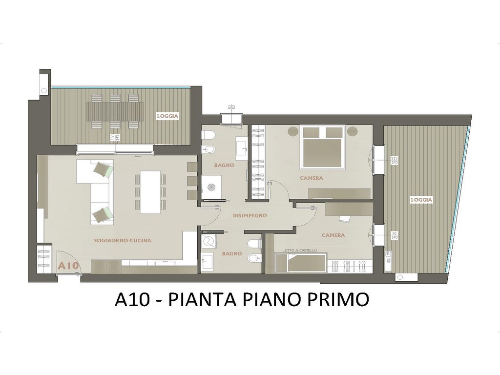 La soluzione del trilocale A10 posto al piano primo si compone di ingresso, ampia zona living con cucina a vista con affaccio su una loggia da 20 mq, disimpegno, due camere e due bagni. Completa la proprietà un ulteriore terrazzo sulla zona notte.