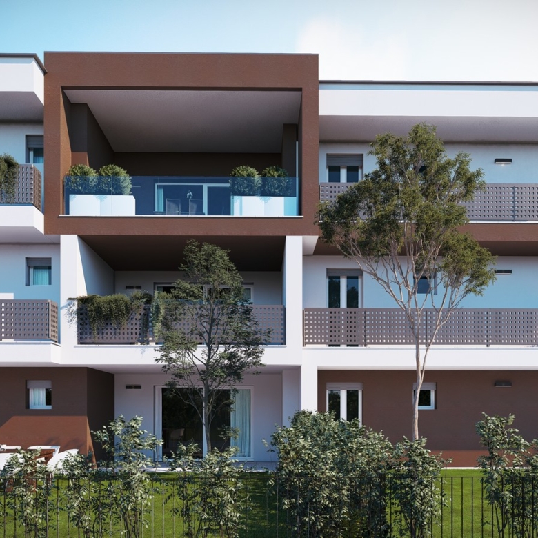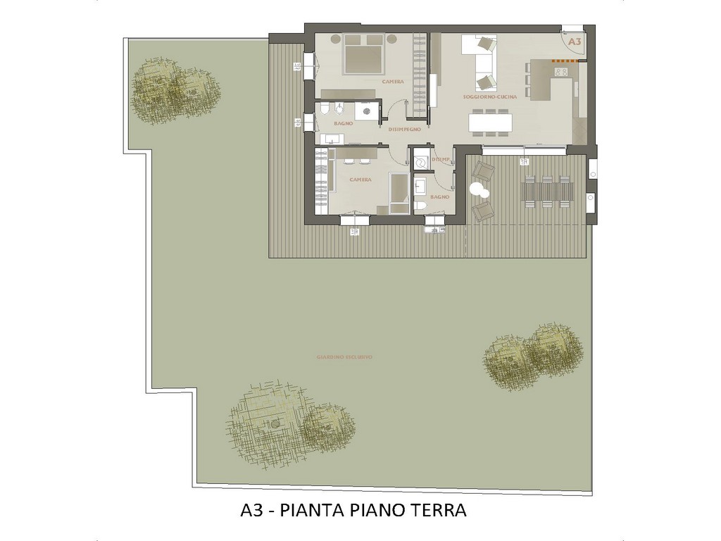 La soluzione del trilocale A3 posto al piano terra si compone di ingresso, zona living con cucina a vista, disimpegno, due camere e due bagni. Completa la proprietà un’ampia zona esterna esclusiva da 240 mq con zona esterna pavimentata.