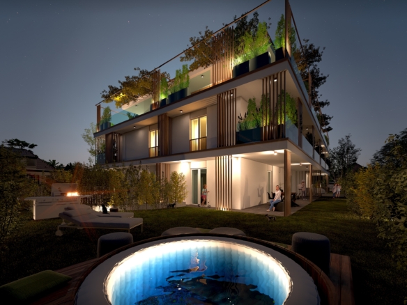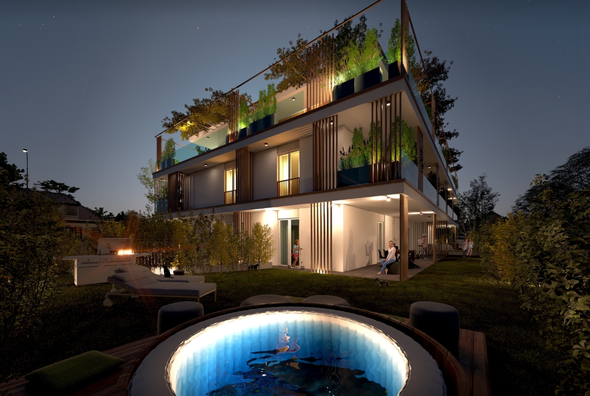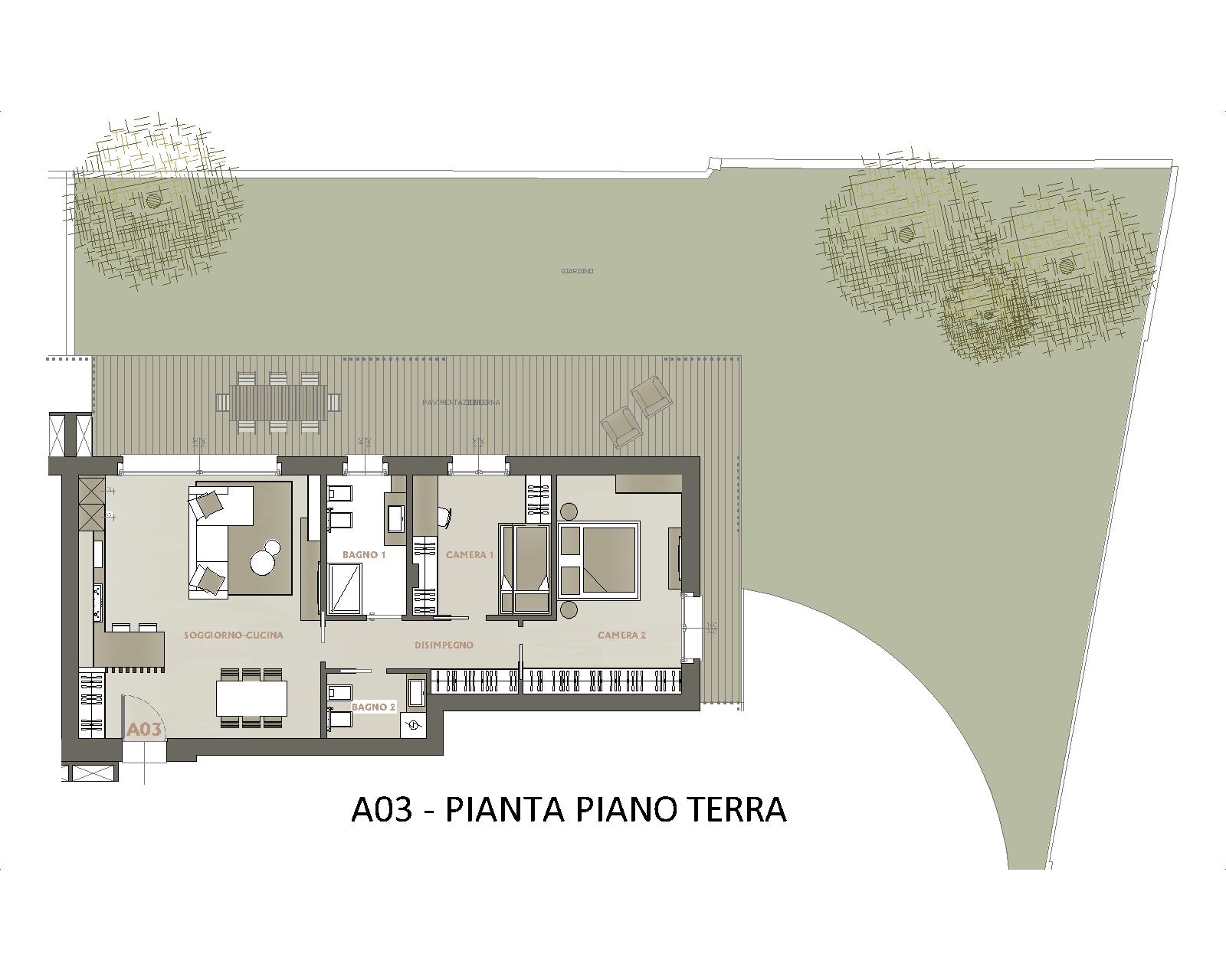 La soluzione, sita al piano terra, si compone di zona living con cucina a vista, disimpegno, due camere, due bagni e circa 210 mq di area esterna privata costituita da giardino e comoda zona lastricata. Impiantistica di ultima generazione ad alta efficienza energetica. Riscaldamento a pavimento autonomo ed impianto fotovoltaico indipendente